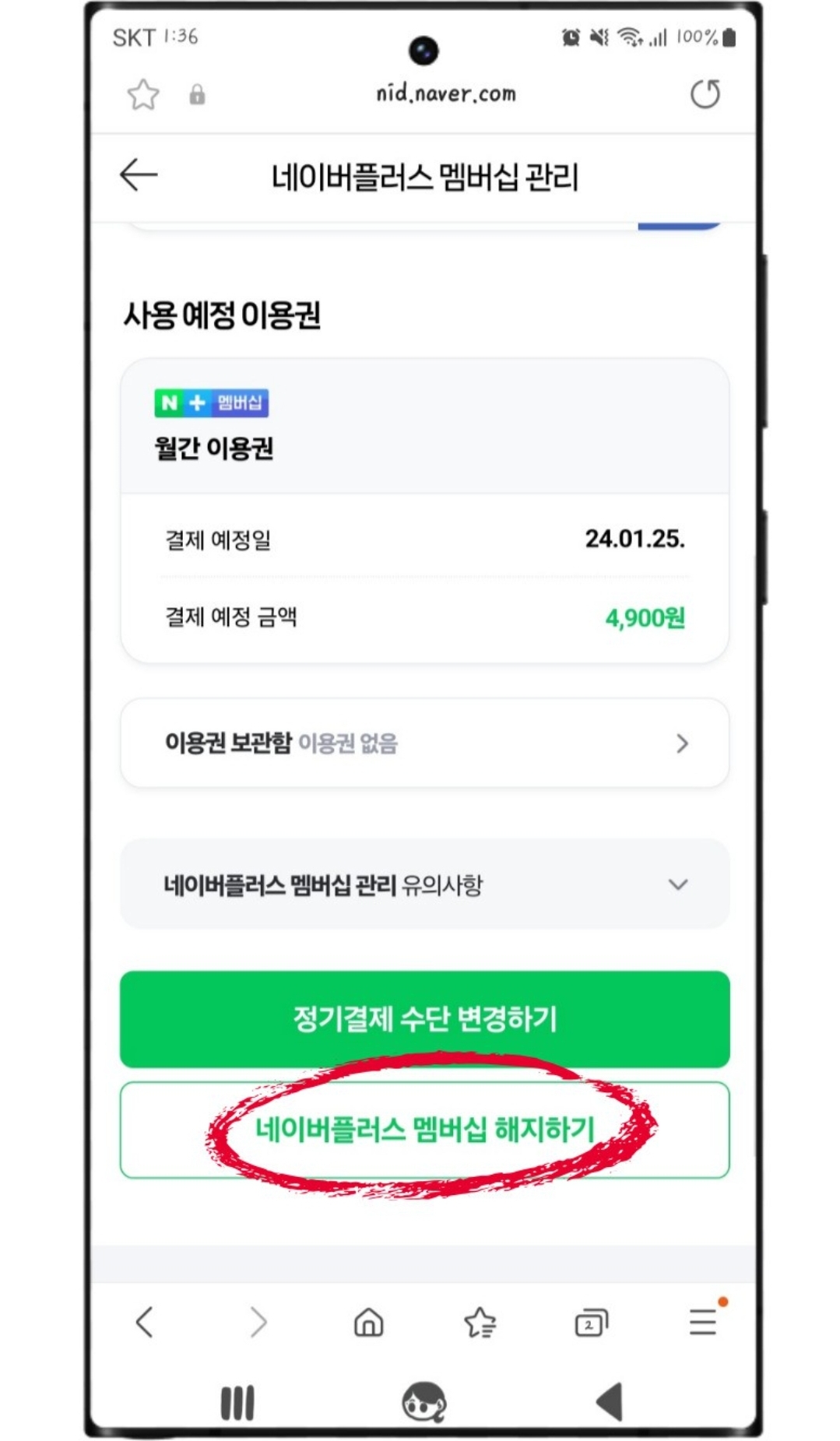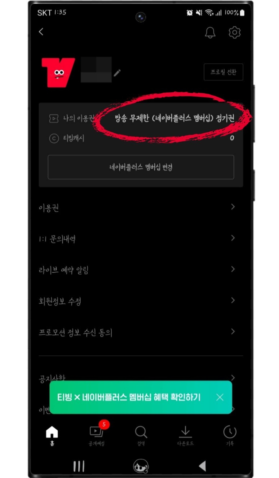 ⑦방송무제한 네이버플러스 멤버십 정기권으로 적용되었는지 확인